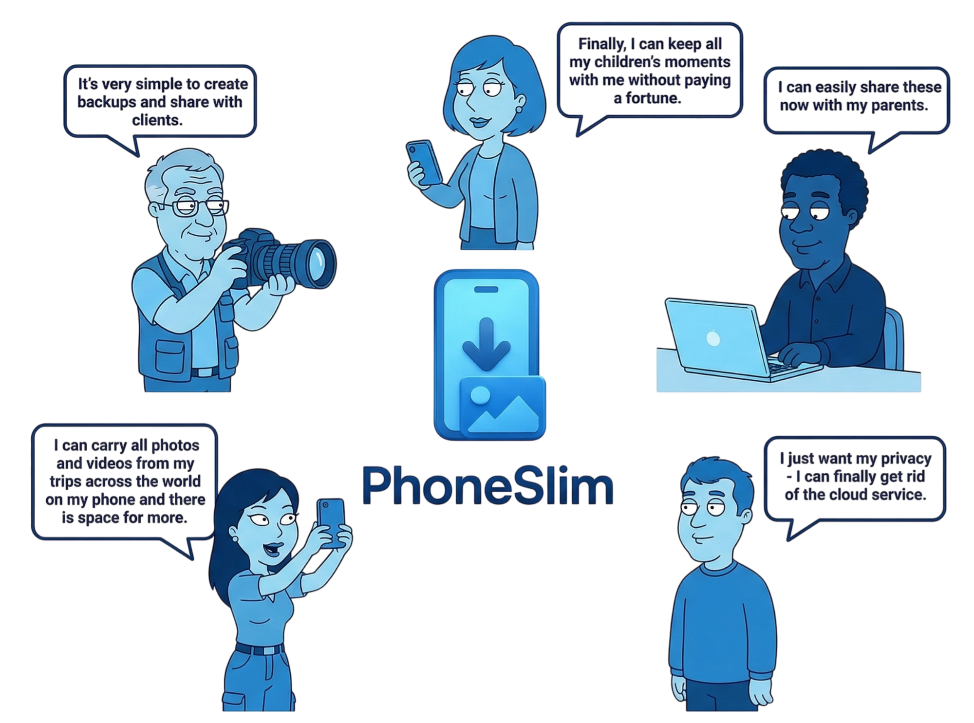 Keep your photos and videos safely on your personal devices. No cloud service is required, and PhoneSlim never accesses or uploads your personal files.