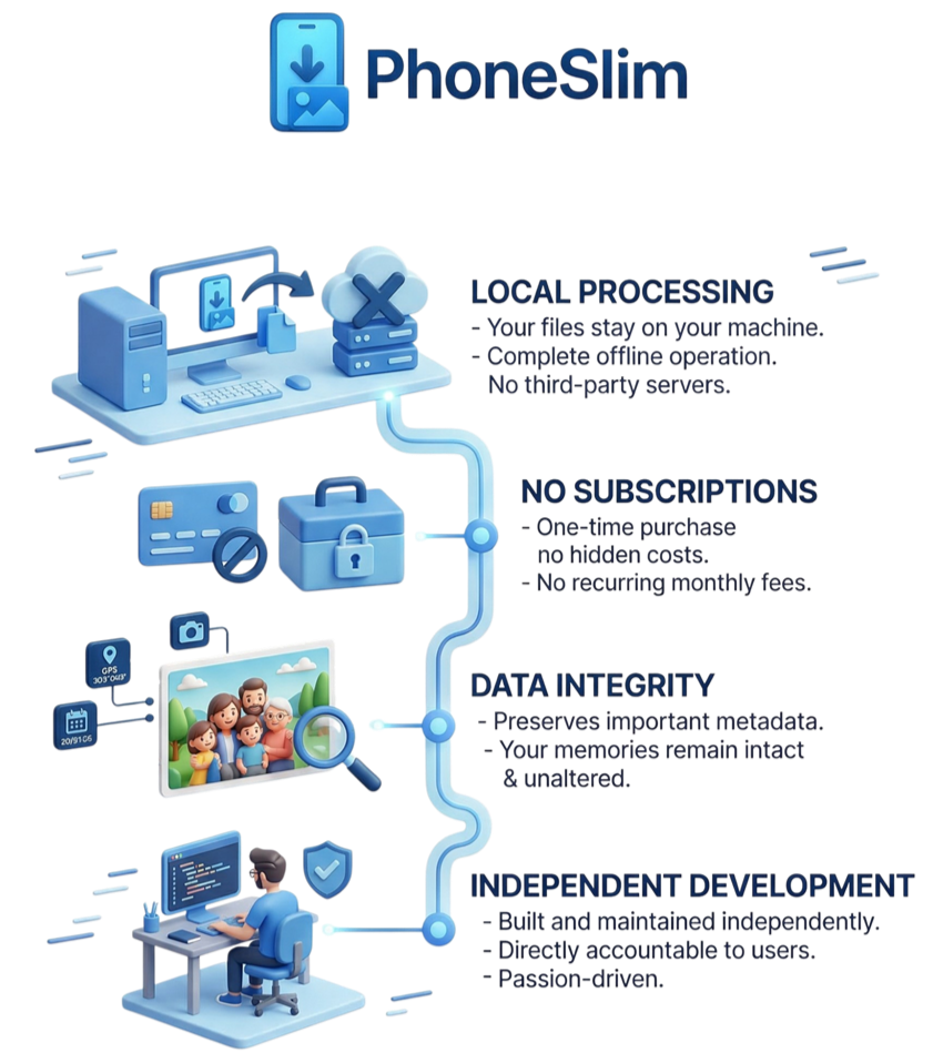 Keep your photos and videos safely on your personal devices. No cloud service is required, and PhoneSlim never accesses or uploads your personal files.